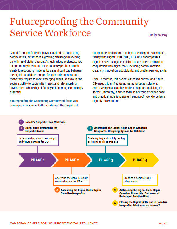 CCNDR and its partners Blueprint, The Dais, Digital Governance Council and Imagine Canada, have published a summary report with an overview of the Futureproofing the Community Service Workforce initiative and its efforts to strengthen digital capacity in Canada’s nonprofit sector. Spanning four phases of research and prototyping, the project assessed the current state of digital skills across the sector, explored hiring and workforce data, and co-developed a hands-on prototype to address the most pressing digital skill gaps.The report highlights what was learned from testing that prototype with nonprofit organizations across the country and offers strategic recommendations for funders, sector leaders, and practitioners to drive long-term digital resilience and capacity-building.