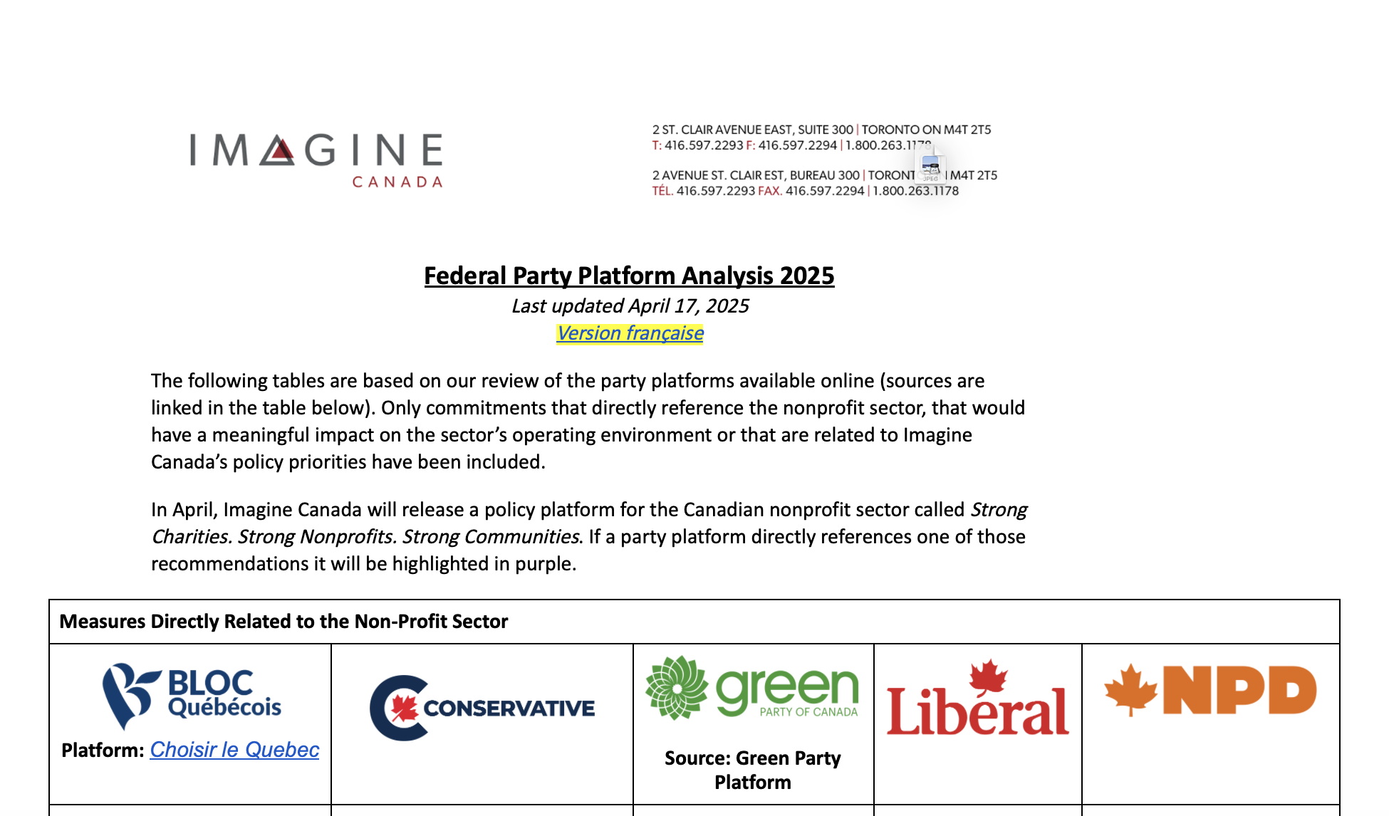 In April, Imagine Canada will release a policy platform for the Canadian nonprofit sector called Strong Charities. Strong Nonprofits. Strong Communities. If a party platform directly references one of those recommendations it will be highlighted in purple.