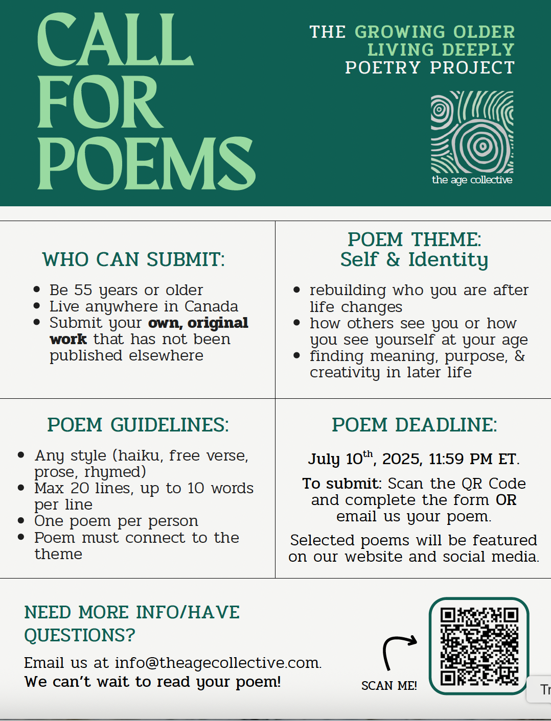 TAC is running a new project called the Growing Older, Living Deeply (GOLD) Poetry Project, which invites older adults (55 yrs+) across Canada to share original poems about the aging experience. The GOLD Poetry Project is a non-commercial, community-driven project launched in May 2025. It aims to amplify the voices and creative expressions of older adults through poetry. We release themed calls for submissions every few months (e.g., love & loss, place & belonging), and select 10 poems per theme to feature on our website and social media. Our current theme is Self & Identity (more details in the poster image below).