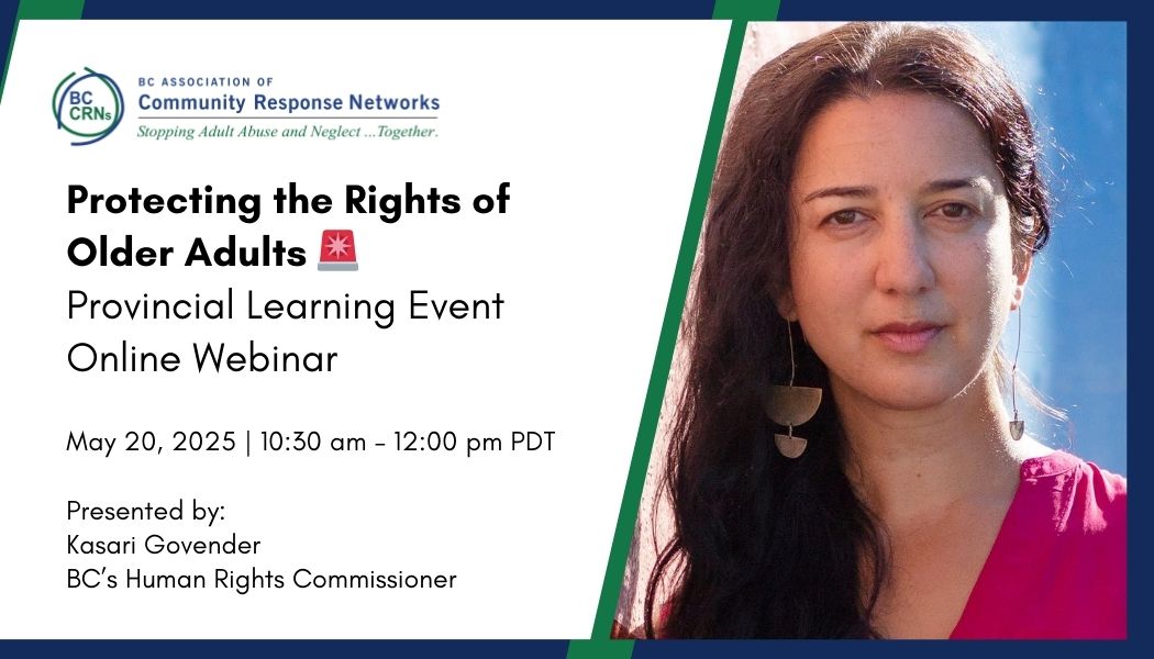 Join BC CRN & Kasari Govender, BC’s Human Rights Commissioner, for a powerful Provincial Learning Event webinar on protecting the rights of older adults.